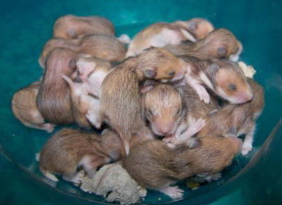 Think you want to breed your hamster? The above pictures were from one litter. There are 14 here! These are Syrian hamsters, and they each need their own cage by the time they are 6 weeks old. That's a total of 16 hamster cages. One for each parent and for each baby.