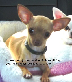 Toby was my beautiful baby boy Chihuahua who left me when he was only 3. I miss him so. He was the baby brother of my other 4 chi’s and my best friend. The day he passed was the saddest day of my life. Toby protected me one morning while I was extremely sick. I had gotten up and did not feel well. As I was standing near him, I fell unconscious and to keep me from hurting myself, he placed himself between my head and the ceramic floor. He gave his life to protect me. He is a true hero and will forever be a large part of my life. I love him and miss him dearly. I wrote this poem to him: